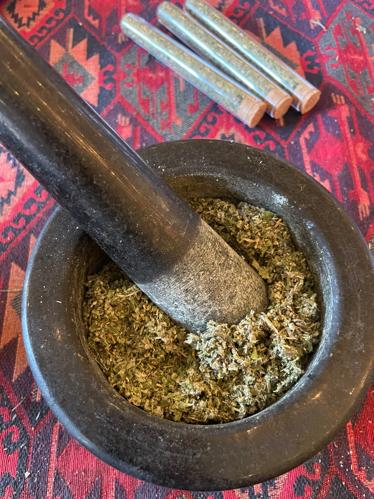 Loose incense herbcrafted in house featuring mugwort, mullein, marshmallow leaf, violet, blue vervain, lavender (all grown in our gardens) & rosemary.