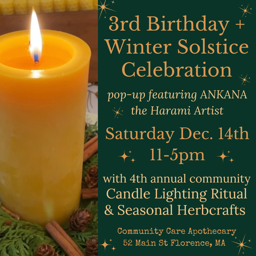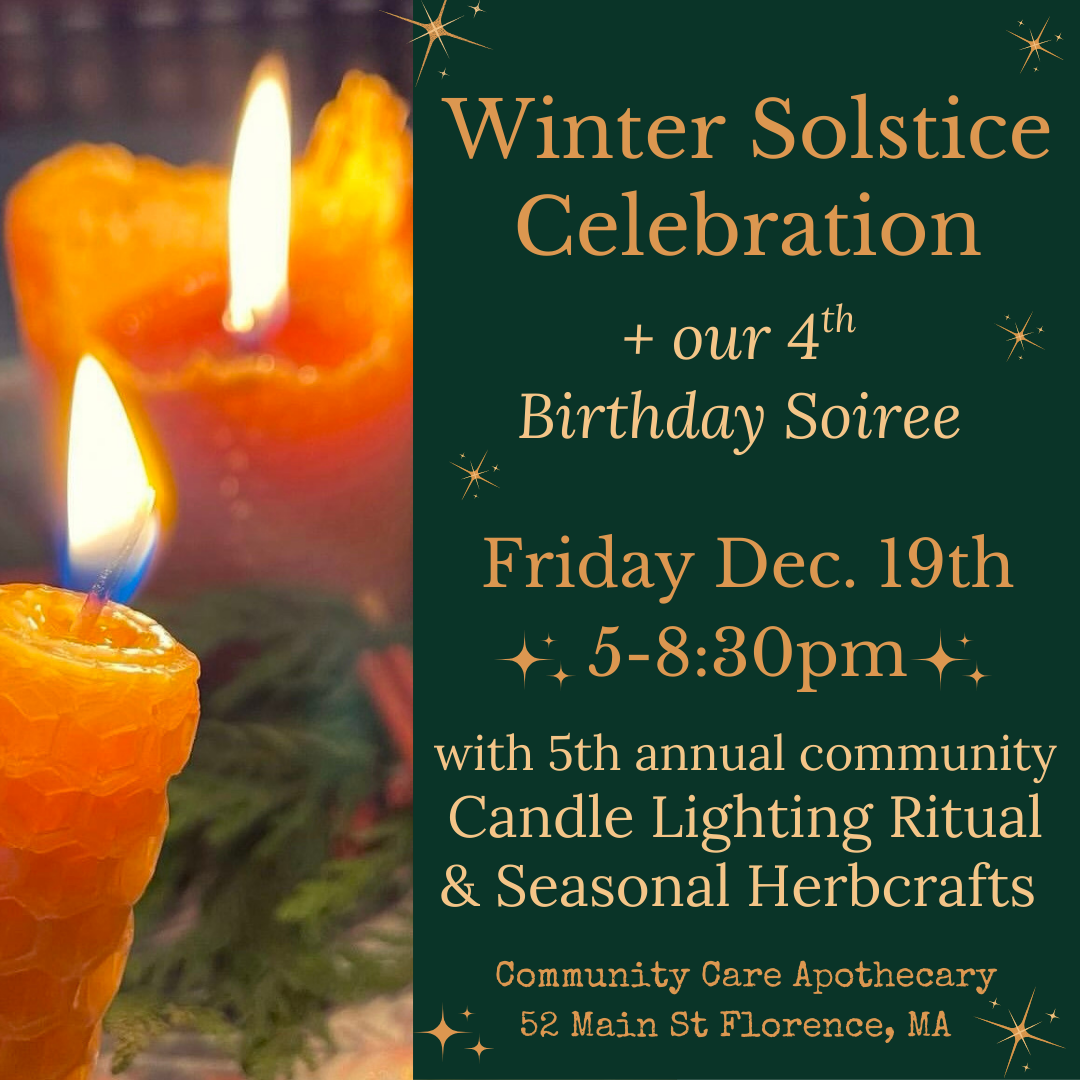 We'll be serving our favorite teas and Yuletide refreshments throughout the evening, making seasonal botanical crafts around the tea table ($10 per maker) and offering a complimentary beeswax candle to bring home from the community candle lighting ritual (this year we also have some non-beeswax candles for the vegans in the crowd!).